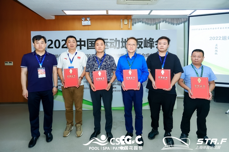 暢森體育(左三)在2022運(yùn)動(dòng)地板峰會(huì)上被授予業(yè)內(nèi)五大領(lǐng)軍品牌榮譽(yù)