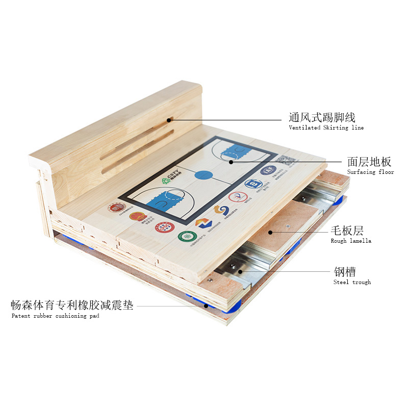 這是一套固定與懸浮相結(jié)合的運動地板系統(tǒng),鋼槽可以將上下兩層毛板有效分隔,同時將底層毛板緊緊地壓在地基上,可以防止運動木地板的大面積橫向或縱向收縮。整體結(jié)構(gòu)強度大,承重能力遠遠大于實木龍骨,利用鋼槽幾字型結(jié)構(gòu),彈性強,將運動地板的運動性能、承載性能、環(huán)境適應(yīng)能力的表現(xiàn)提升到了一個全新的高度。
